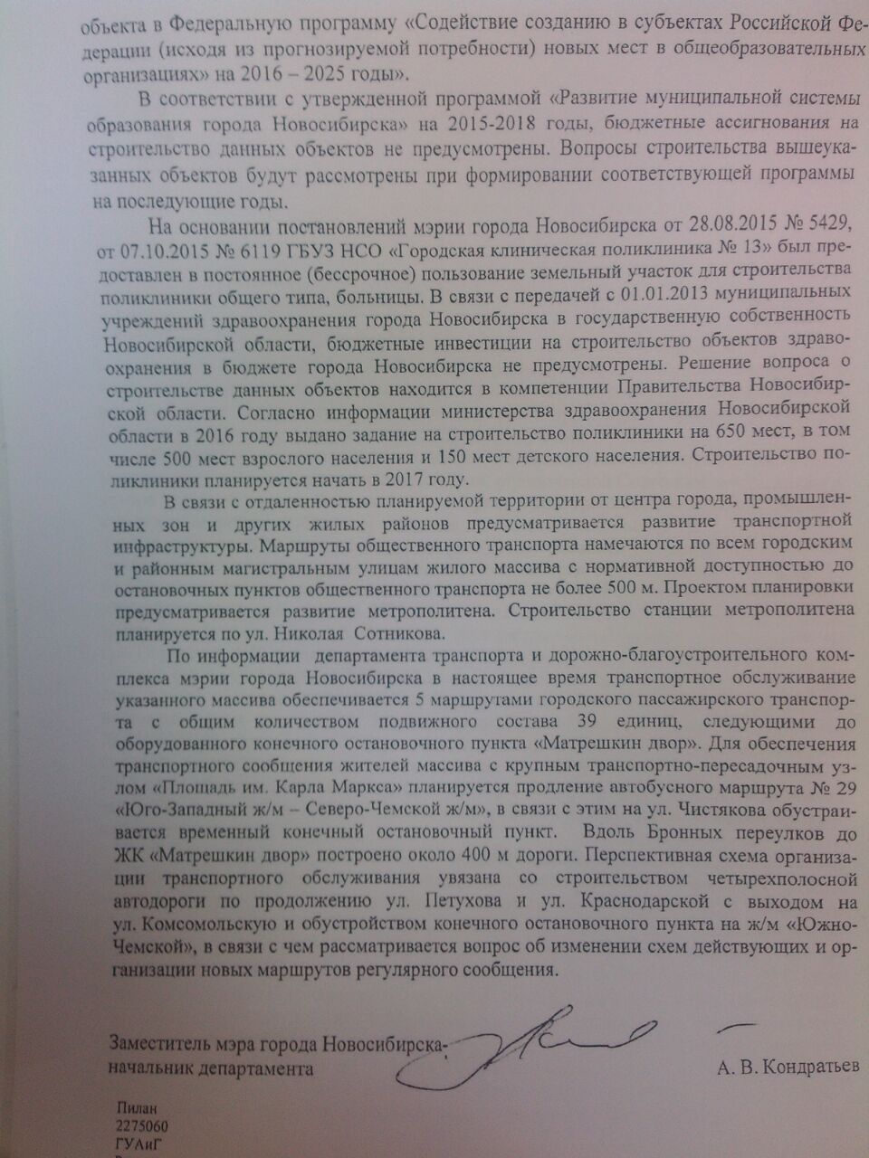 Ответ мэрии города Новосибирска на обращение жителей Просторного ж/м к властям по социальной инфраструктуре